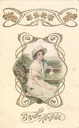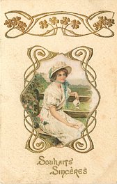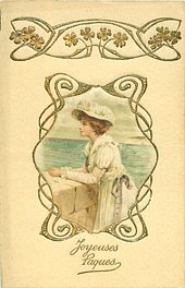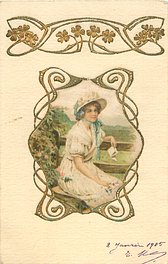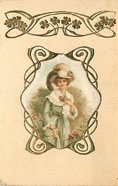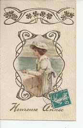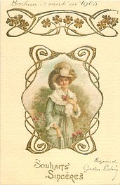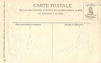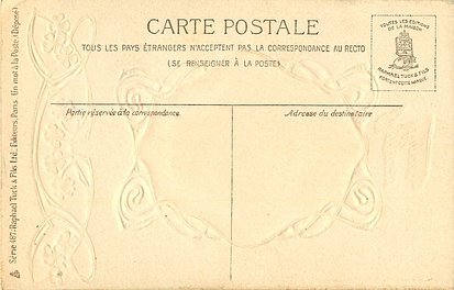 gilt embossed elaborate nouveau gilt decoration around irregular silk insets, UN MOT A LA POSTE, (DEPOSE)