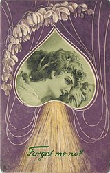 girl's head resting on hand, in inverted heart, violet on green