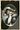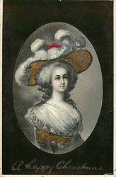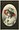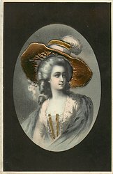 oval inset of woman facing front, looking left/front, blue enamel underside to brim of hat