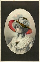 oval inset of woman facing partly left, looking left, pink enamel underside to brim of hat