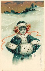 girl in green outdoors outfit, red lining to cape, black muff, white scarf