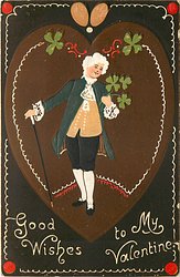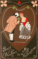 GOOD LUCK TO MY VALENTINE man gives 4 leaf clovers to lady, old style dress, ornate decorations