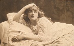 girl on bed, pillow right, girl's left elbow on pillow holding her head, she looks up