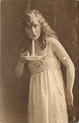girl facing left, looking forward, hold candle in right hand