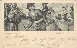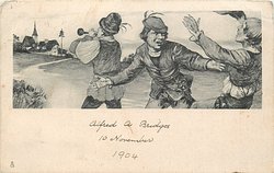 man carrying jug on stick, while young man takes a girl by the hand, couple walks behind