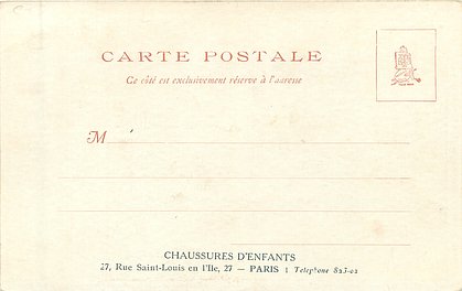 u/b, titled on front in both French & English, UN MOT A LA POSTE, (DEPOSE),comes with CHAUSSURES D'ENFANTS, 27, RUE SAINT-LOUIS EN I'LLE-PARIS, TELEPHONE 823-02 on back, same image, English back, 871, ART 871, CHRISTMAS 1865, ART or CONNOISSEUR 2538