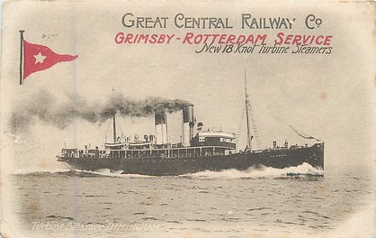 GREAT CENTRAL RAILWAY CO. NEW 18 KNOT TURBINE STEAMERS opt in red GRIMSBY-ROTTERDAM SERVICE