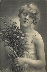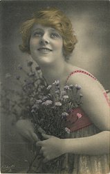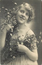 girl with short hair, off shoulder dress, many flowers held to chest with both hands, facing left, looking front & up