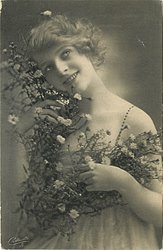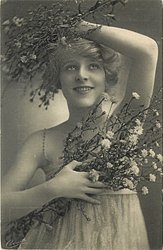 girl with short hair, off shoulder dress, many flowers in right arm but only single stem in left, smiling, looking front