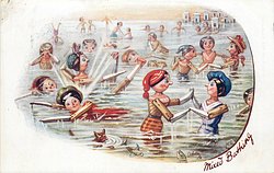 MIXED BATHING ocean scene with land on the right