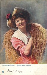 "COMIN' THRO' THE RYE." woman carrying rye over shoulder, hat with red flower