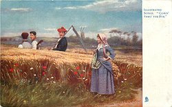 "COMIN' THRO' THE RYE." man with scythe looking left in rye field, woman facing man