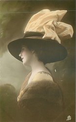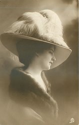 elegant lady with feathered hat & fur cape, looks left, feather extends back