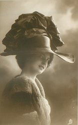 elegant lady with feathered hat & fur cape, looks right