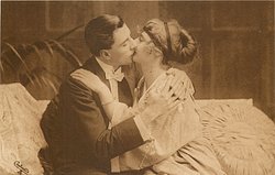 lovers kiss, man above, woman's left hand visible at man's left elbow, her right arm round his neck