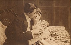 man right leans forward to embrace reclining lover, her right hand on his left shoulder, they look into each others eyes