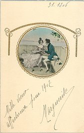 insets of old style couples framed in gilt embossed design