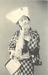 standing three-quarter length study, chequered dress, left hand holds cloth to lips, tray in right hand, white cap