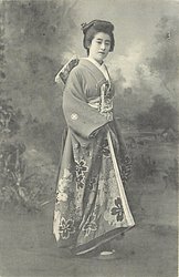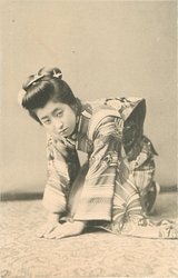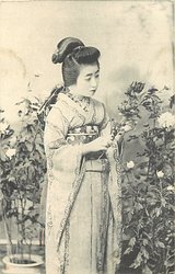 standing three-quarter length study, facing partly right looking at spray of chrysanthemums, others around