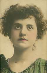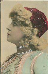 head & shoulders study of girl wearing felt cap on back of her head, facing left, looking up