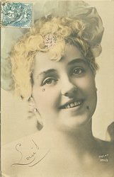 girl with frizzy hair, felt hat on top of head, her right hand to right side of her face, faces & looks front