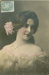 girl with her long hair back out of sight, large flower over her right ear, off shoulder dress, faces front, looks right