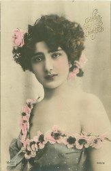 girl with hair pinned up, seated facing half left, looking front, wreath with berries in hair