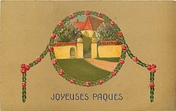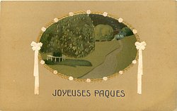 JOYEUSES PAQUES below small rural insets in embossed ribbon borders on tan cards