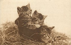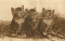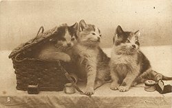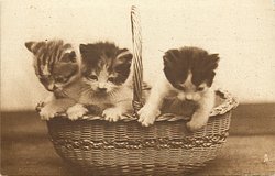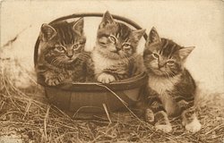 three kittens, one in basket on left with handle, on straw, two to right touch each other