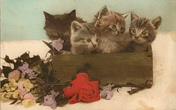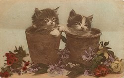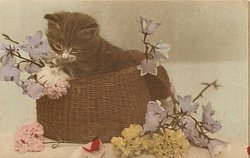 three kittens sitting up in basket, another beside it meows, flowers strewn about