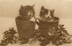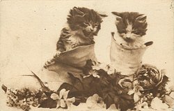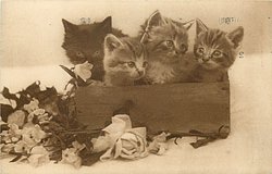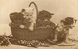 three kittens sitting up in basket, another beside it meows, flowers strewn about