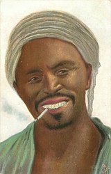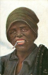 head and shoulders of black man with turban and cigarette hanging out of mouth