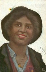 black woman, dark hat with yellow flower, dark jacket, dark pink vest