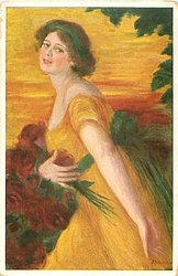 girl in yellow dress faces left looks front, red roses right