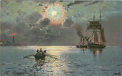 night scene, moon high & central ,three boats right, row boat front left/central, lighthouse distant left