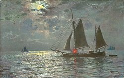 night sea view, sailing boat moves away with row boat in tow, moon high left