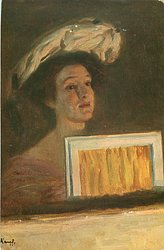 head & shoulder study of woman wearing red scarf descending from her hair, silver dress, she looks down
