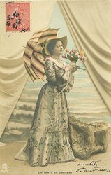 girl stands facing right, parasol over shoulder with eyes closed smelling bunch of flowers held to her face