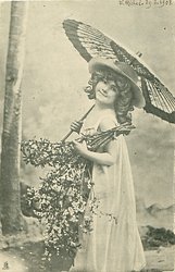 girl carries Japanese style umbrella over her right shoulder, mass of floral branches on left arm, faces left, looks front