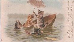 four cats & sinking rowboat, one holds up parasol, ginger cat also in boat, one swims holding on to oar, another swims looking at boat