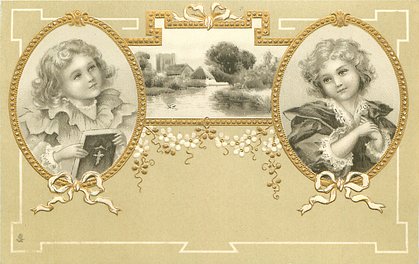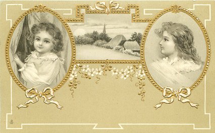 la joie du foyer (1904 list) , inset of child on each side of card separated by rural inset