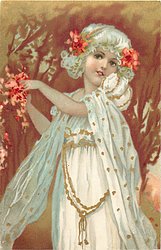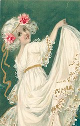 pretty girl in white with red ribbon & flower on hat, holds dress with both hands, looks right