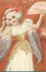 pretty girl in white holds fan in right hand, holds bowl lamp on stick over her left shoulder