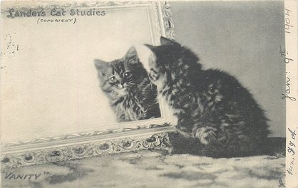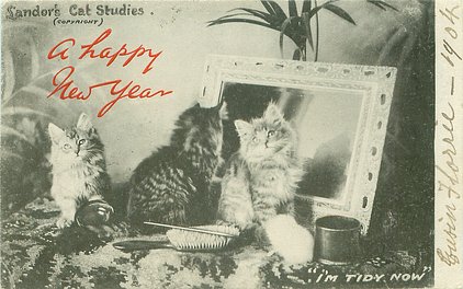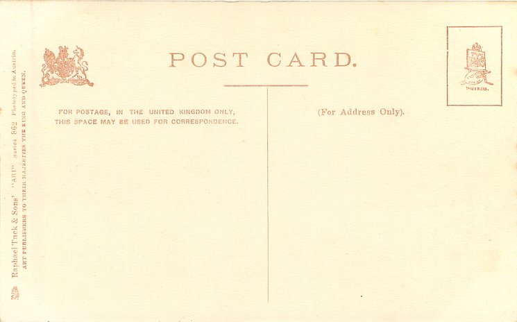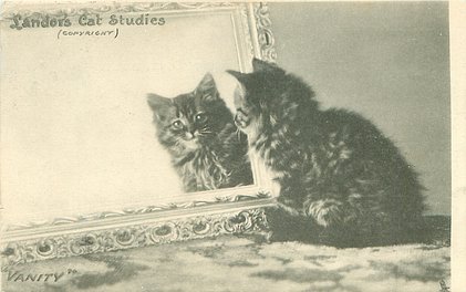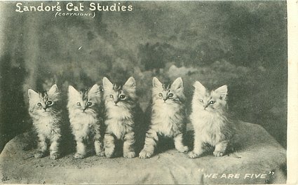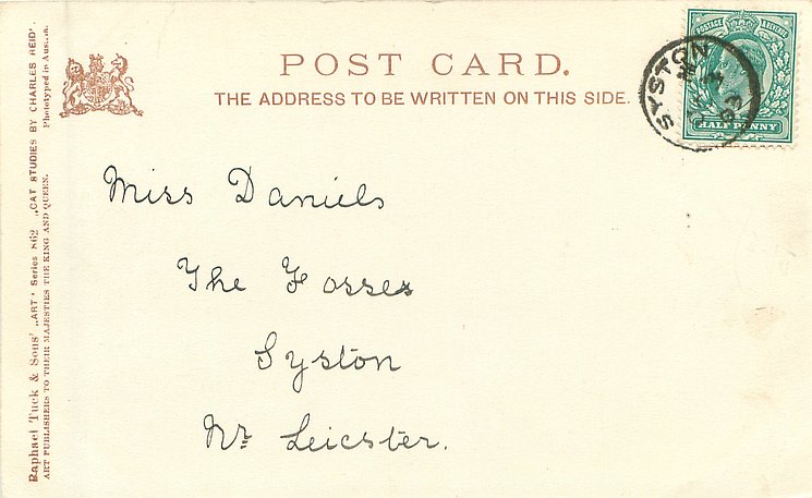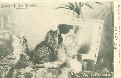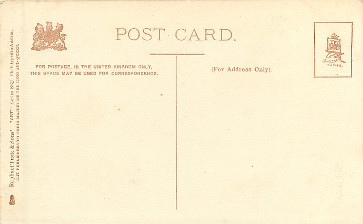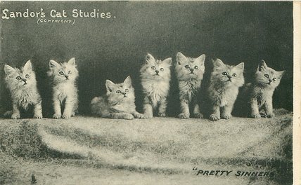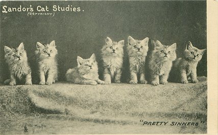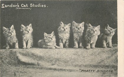 u/b or divided back, grey, ART, 4 backs PHOTOTYPED IN AUSTRIA, come with CAT STUDIES BY CHARLES REID on back, many of same images come in ART sets 862-865 & REAL PHOTOGRAPH 5089/93 & in PHOTOCHROME 6495/6496 CAT STUDIES & 7006/7007 SAPPHIRE, French backs in long sets SERIE 252 & SERIE 409, listed in 1904 POSTCARD Catalogue