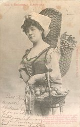 L'AUTOMNE woman faces left, carrying 3 woven baskets filled with fruit