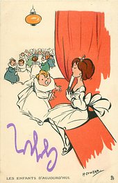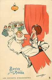 same image, English back, HUMOROUS 6076 OUR PARTY, PATTY-AS HER FOURTH YOUTHFUL PARTNER.. comes opt. in blue BONNE ANNEE
