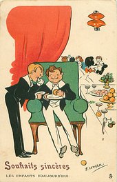 same image, English back, HUMOROUR 6076 OUR PARTY, GLORIOUS, ISN'T IT? comes opt. in gilt SOUHAITS SINCERES