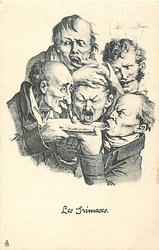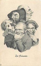 head & shoulder study of three men & 2 women all with peculiar expressions, man in centre pouts his lips