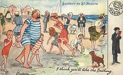 I THINK YOU'LL LIKE THE BATHING father leads hesitant children down very crowded beach