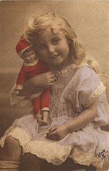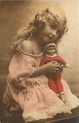 girl sits with doll on lap, facing right, looks front & up